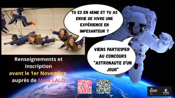 Le CNES propose un concours qui s'adresse aux élèves de 4eme souhaitant vivre une expérience extraordinaire de vol en impesanteur dans l'avion ZERO G. L'inscription est individuelle et se fait auprès de Mme LALO.