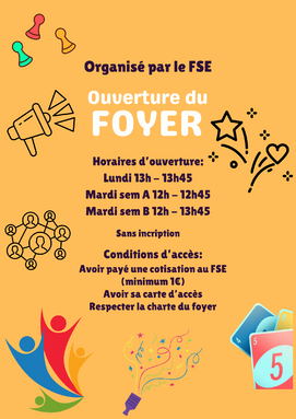 Le foyer ouvre à partir du lundi 17 Novembre. La salle se trouve à côté de la permanence 2.