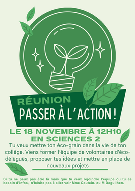 Tu souhaites t'investir dans l' Ecologie et le Développement Durable du collège. Viens participer à la première réunion pour échanger tes idées.